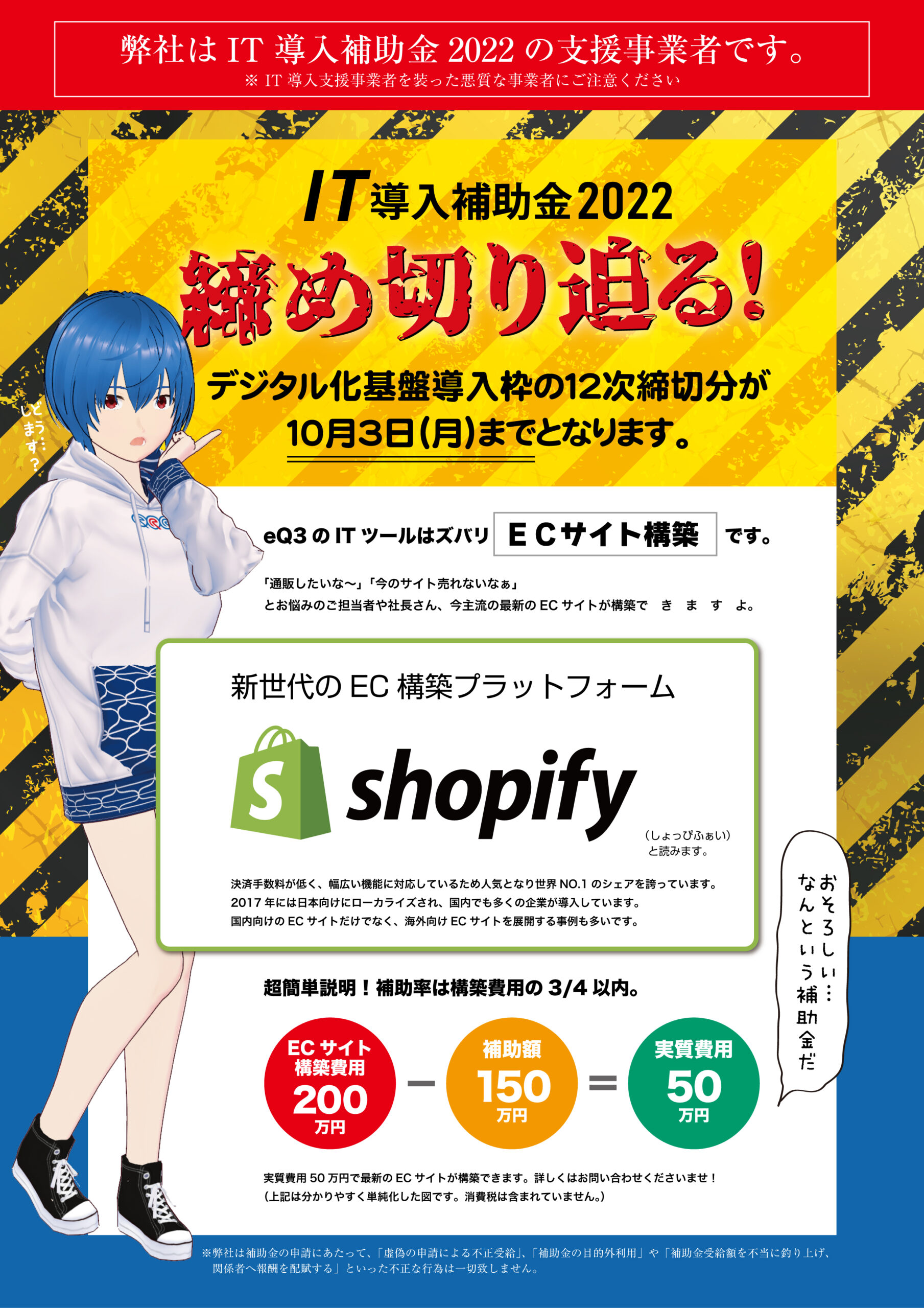 超分かりやすく言うと、ECサイト構築費用が200万円だとすると、補助額は150万円。